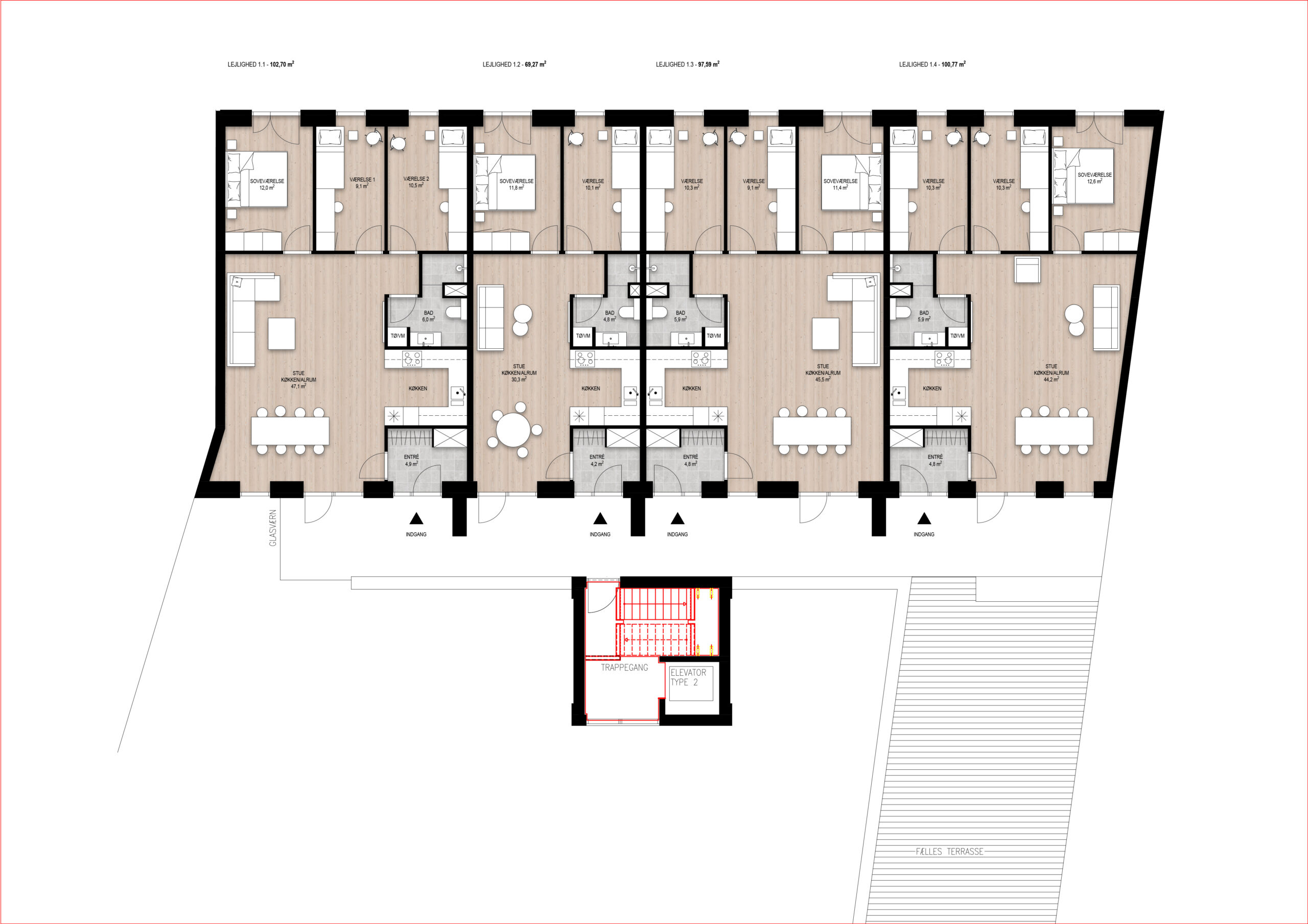 | 1-1 | Ledig | 4 | 1. sal | SNART | 102,7 | 10.269,00 | 500 | 200 | 30.807,00 | 30.807,00 | Plantegning | Kontakt |